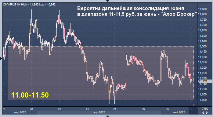 Вероятна дальнейшая консолидация юаня в диапазоне 11-11,5 руб. за юань в ближайшие дни, считает руководитель направления инвестиционного консультирования "Алор Брокера" Алексей Антонов.
