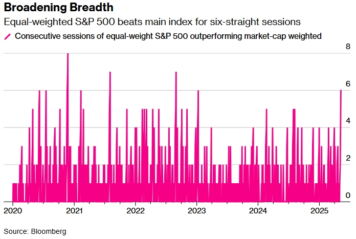 Равновесная версия индекса S&P 500, которая не делает различий между стоимостью таких гигантов, как Amazon.com Inc., и относительно небольших компаний, таких как Axon Enterprise Inc., превзошла стандартный взвешенный по капитализации индекс S&P 500 в течение шести последовательных торговых сессий. Это самая продолжительная серия превосходства с января 2023 года, и она свидетельствует об оптимизме относительно способности большего числа компаний управлять прибылью, экономикой и, конечно же, фондовым рынком.