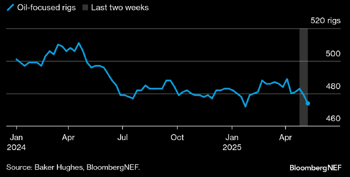Число активных нефтяных буровых в США (серым подсвечено снижение последних двух недель). Данные: Baker Hughes, источник: Bloomberg