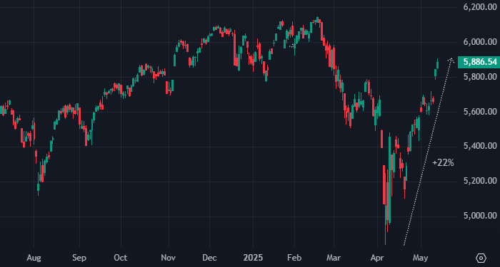 С минимумов апреля S&P 500 отскочил уже на 22%, и Дональд Трамп обещает, что рынок «пойдет намного выше». Об этом президент США сообщил во время инвестиционного форума в Эр-Рияде во вторник.