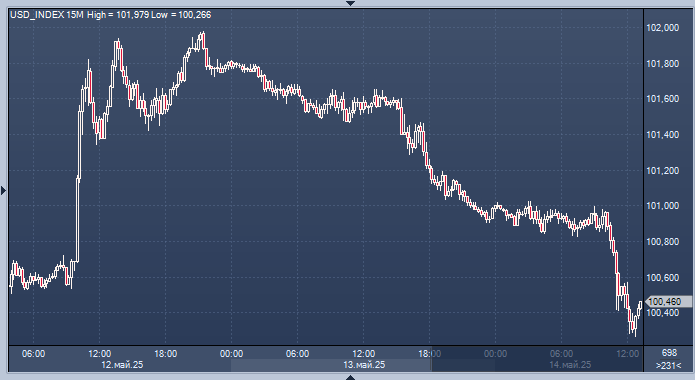 Индекс доллара, который отражает курс валюты по отношению к шести основным валютам, снизился на 0,45% и достиг отметки 100.