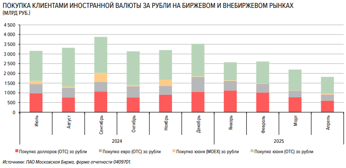 «Суммарные покупки валюты клиентами банков в апреле достигли минимума с момента прекращения части валютных торгов на Московской Бирже. В апреле на покупку иностранной валюты на внутреннем рынке было направлено 1,8 трлн рублей. Для сравнения: в I квартале 2025 г. этот среднемесячный показатель составил 2,5 трлн руб.», — говорится в документе.