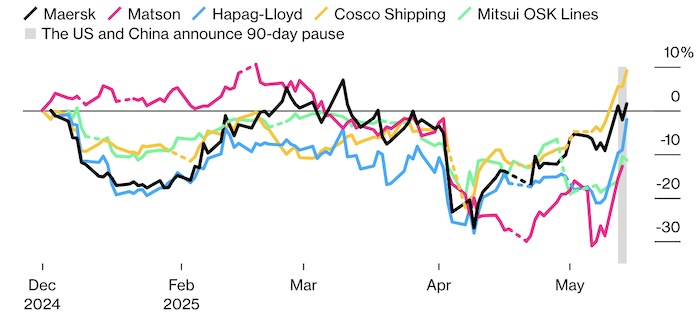 США снизили совокупные пошлины на большинство китайского импорта до 30% с 145% на период в 90 дней, в то время как китайские пошлины в 125% на американские товары упадут до 10%. Датский судоходный гигант Maersk зафиксировал увеличение заказов в течение нескольких часов после объявления торговой сделки, которая дала компаниям долгожданную передышку.