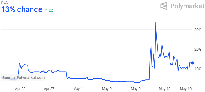 Текущее значение в 13% заметно ниже пика в 36%, достигнутого ночью с 11 на 12 мая, когда Владимир Путин предложил Киеву прямые переговоры в Стамбуле 15 мая. Тем не менее это самое высокое значение за период с 19 апреля до 11 мая.