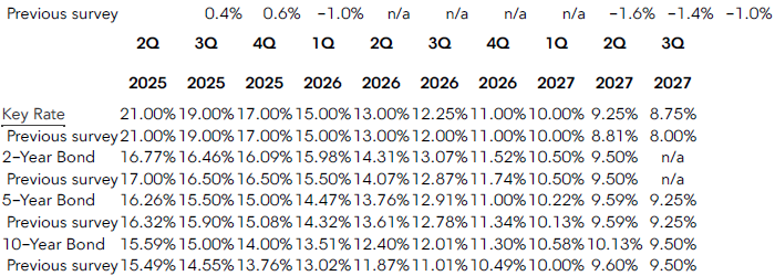 Прогноз по ключевой ставке на конец 2025 г. составляет 17,00%, к концу 2026 г. — 11,00%.