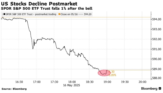 Фьючерсы S&P 500 упали более чем на 1% к 7:30 утра в понедельник, в то время как контракты на Nasdaq 100 снизились немного больше. В пятницу биржевой фонд, отслеживающий американскую фондовую биржу, упал примерно на 1% после закрытия обычных торгов в ответ на действия Moody's.