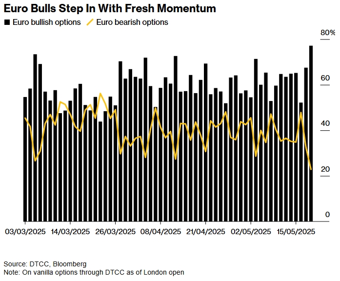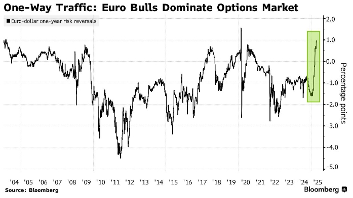 Ещё одним признаком того, что уверенность в дальнейшем росте евро растёт, является то, что так называемые развороты риска — которые измеряют разницу в предполагаемой волатильности между бычьими и медвежьими настроениями — выросли в последние дни. Это особенно заметно в долгосрочных перспективах, где настроения сейчас самые бычьи за последние два десятилетия, если не считать период пандемии.