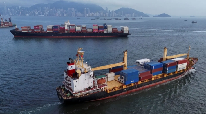 Суда, перевозящие грузовые контейнеры, проплывают возле контейнерного терминала Квай Цин в Гонконге, Китай, 23 апреля 2025 г. REUTERS/Tyrone Siu