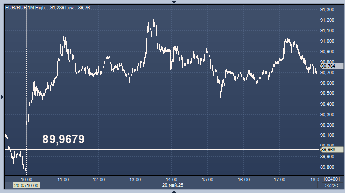 - 89,9679 рубля за 1 евро