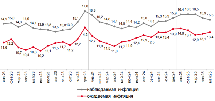 Одновременно с этим наблюдаемая инфляция снижается второй месяц подряд, и в мае данный показатель опустился до 15,5% — самого низкого уровня с ноября.