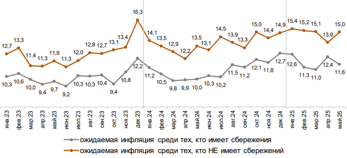 В группах респондентов, которые имеют и не имеют сбережений, отмечена разнонаправленная динамика ожидаемой инфляции. В первой категории отмечено снижение показателя до 11,6%, тогда как во второй он подскочил до 15,0%.