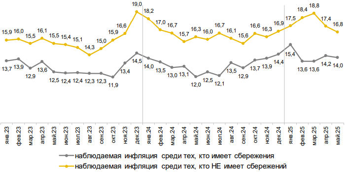При этом в обеих группах респондентов отмечено снижение наблюдаемой инфляции: до 14,0% и 16,8% соответственно.
