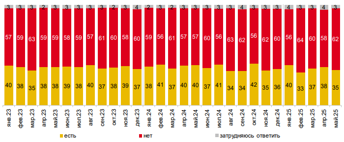 Таковы результаты опроса «инФОМ», проведенного по заказу Банка России 30 апреля — 14 мая 2025 г. среди 2000+ респондентов в 100 населенных пунктах в 54 субъектах РФ.