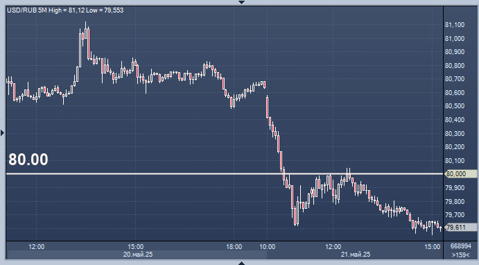 Российский рубль в среду укрепился за пределы уровня 80 за доллар США, достигнув тем самым самого высокого уровня с июня 2023 года. К 15:06 мск среды рубль вырос на 1,22% до 79,64 за доллар США, свидетельствуют данные LSEG, основанные на внебиржевых котировках. В этом году российская валюта подорожала к доллару более чем на 40%.