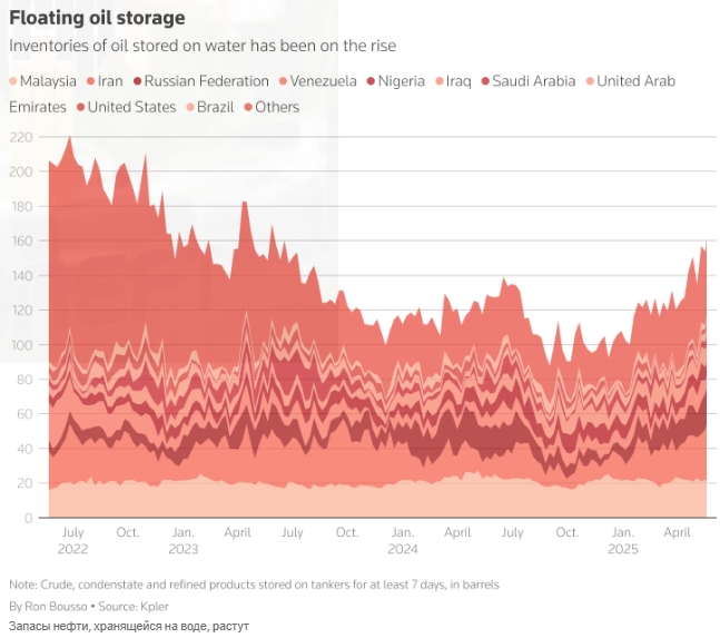 По данным аналитической компании Kpler, за последний месяц объём сырой нефти, конденсата и нефтепродуктов, которые находились в танкерах более семи дней, увеличился на 14% и достиг 160 миллионов баррелей, что является самым высоким показателем за два года.