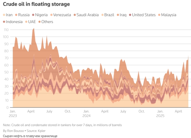 На этой неделе объём сырой нефти на плавучих платформах достиг 74 миллионов баррелей. По данным Kpler, Иран и Россия в значительной степени ответственны за этот показатель, на их долю приходится 29 и 11 миллионов баррелей соответственно.