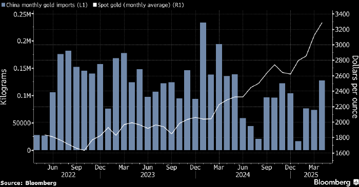 В апреле Китай импортировал наибольшее количество золота за последние 11 месяцев — 127,5 тонн — несмотря на рекордно высокие цены. Это на 73% больше, чем в марте, что объясняется активным спросом со стороны институциональных и розничных инвесторов на фоне геополитической напряжённости и торговой войны.