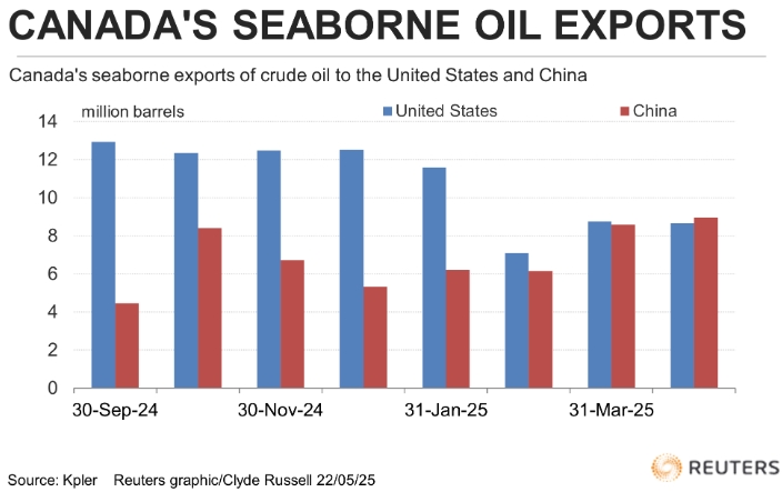 Впервые в апреле Канада экспортировала больше морской нефти в Китай, чем в США. Это показывает, как рынок может меняться в условиях неопределённости, вызванной торговой войной Трампа.