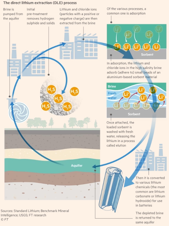 Процесс прямого извлечения лития (DLE). Исходный. Рассол откачивается из водоносного слоя. Предварительная обработка удаляет сероводород и твердые частицы. Затем из рассола извлекаются ионы лития и хлорида (частицы с положительным или отрицательным зарядом). Из различных процессов наиболее распространенным является адсорбция. Сорбент. При адсорбции ионы лития и хлорида в рассоле высокой солености адсорбируют (прилипают) к небольшим гранулам сорбирующего материала на основе алюминия. Рассол. Пресная вода. После прикрепления загруженный сорбент промывается пресной водой, высвобождая литий в процессе, называемом элюированием. Водоносный горизонт. Затем его преобразуют в различные литиевые химикаты (наиболее распространенными являются карбонат лития или гидроксид лития) для использования в батареях. Истощенный рассол возвращается в тот же водоносный горизонт. Источники: Standard Lithium; Benchmark Mineral Intelligence; USGS; исследование FT.