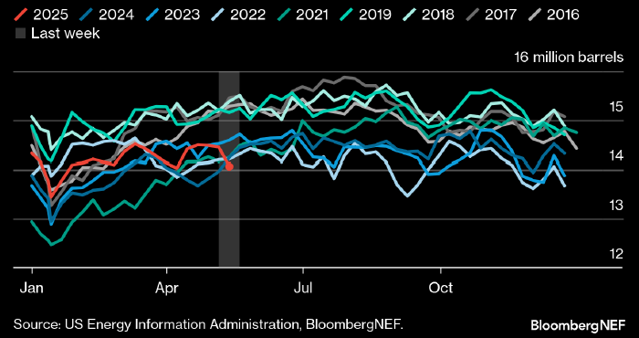 «Спрос на бензин, дистилляты и авиационное топливо снизился по сравнению с предыдущей неделей. Если слабый спрос на дистилляты наблюдается уже несколько недель подряд, то падение спроса на бензин и снижение активности в аэропортах выглядят нетипичными для этого времени года: обычно именно сейчас начинается сезон летних поездок», — пишут аналитики BloombergNEF. — «Активность путешественников в аэропортах остается низкой уже вторую неделю подряд, что резко контрастирует с рекордными показателями последних двух месяцев. При этом предстоящие выходные по случаю Дня поминовения — неофициальное начало лета в США — могут подтолкнуть потребление вверх, т. к. американцы начнут массово путешествовать».