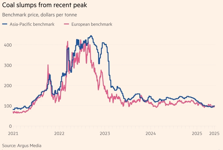 Стоимость морского угля, который используется на электростанциях для производства электроэнергии, упала до четверти от своего пикового значения, достигнутого в 2022 году, когда начался украинский конфликт, вызвавший энергетический кризис и повышенный спрос на уголь.