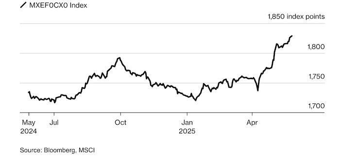 «Мы действительно видим, как звезды выстраиваются в ряд», — отметила Эми Олденбург, которая руководит инвестициями в акции развивающихся рынков в Morgan Stanley Investment Management. «Доллар заметно ослаб — это дает попутный ветер нашим рынкам».
