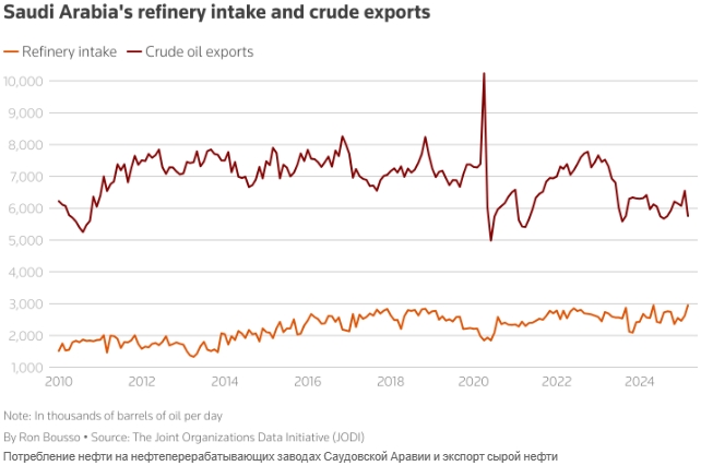 Согласно данным Joint Organizations Data Initiative (JODI), в марте на внутренних заводах королевства было переработано 2,94 миллиона баррелей в сутки. Это стало самым высоким показателем за месяц и лишь немного ниже рекордного уровня в 2,96 миллиона баррелей в сутки, достигнутого в апреле 2024 года.