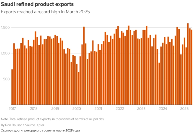 По данным компании Kpler, которая отслеживает движение судов, экспорт нефтепродуктов из Саудовской Аравии, включая дизельное топливо, бензин, авиационное топливо и мазут, в марте достиг рекордных 1,58 миллиона баррелей в сутки. В апреле этот показатель снизился до 1,48 миллиона баррелей в сутки, а в мае составляет 1,42 миллиона баррелей в сутки. Вероятно, это связано с остановкой нефтеперерабатывающих заводов.