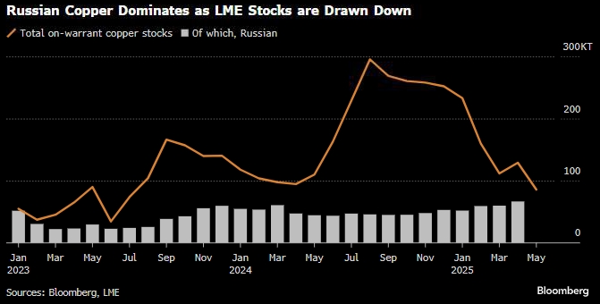 LME запретила поставки недавно произведенной российской меди после того, как США и Великобритания ввели санкции в апреле 2024 года, однако старый российский металл по-прежнему доступен для торговли на бирже, в том числе компаниями из США и Великобритании.
