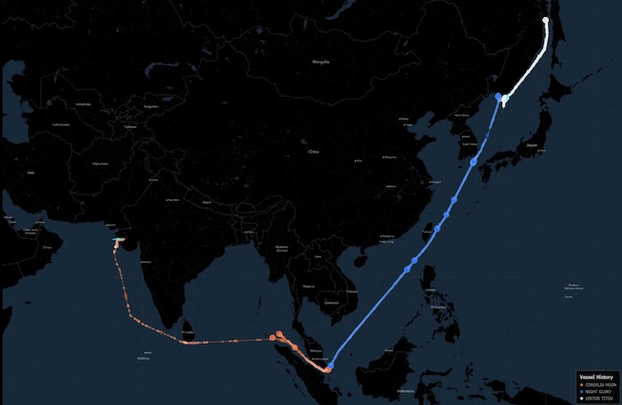 В конце марта «Виктор Титов» — танкер, который попал под санкции Минфина США в январе в рамках широкой волны ограничений — погрузил около 500 000 баррелей «Сокола» с российского терминала-Де-Кастри. Затем судно отплыло к бухте Находка рядом с Козьмино и через неделю перегрузило нефть на «Найт Глори».