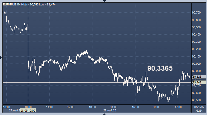 - 90,3365 рубля за 1 евро