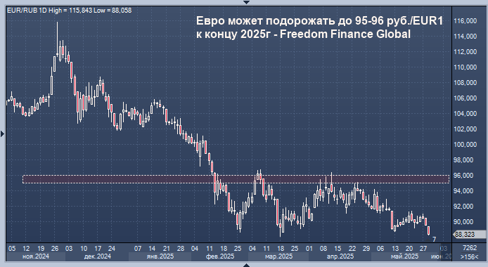 К концу текущего года европейская валюта может вырасти в цене до 95–96 рублей за евро. В течение ближайшей недели курс евро, вероятно, будет находиться в диапазоне 89–91 рубль за евро, говорится в материале ведущего аналитика Freedom Finance Global Натальи Мильчаковой.