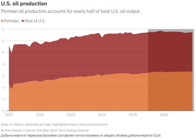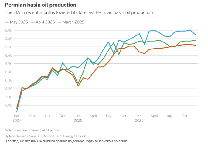 В Пермском бассейне, по прогнозам, добыча сланцевой нефти в 2025 году составит в среднем 6,51 млн баррелей в сутки, что ниже предыдущей оценки в 6,58 млн баррелей в сутки. Однако это всё равно будет значительным увеличением по сравнению с 6,3 млн баррелей в сутки в 2024 году.