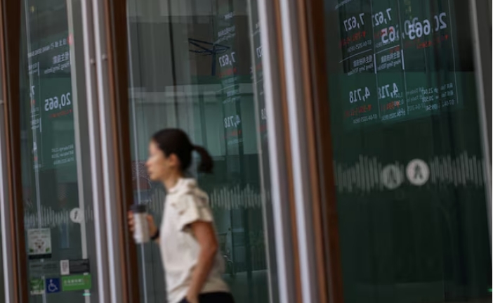 Экран, отражающийся на стекле, отображает фондовый индекс Hang Seng в центральном районе Гонконга, Китай, 7 апреля 2025 г. REUTERS/Tyrone Siu