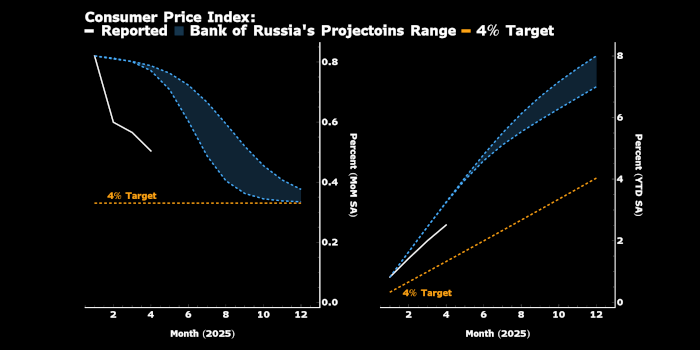 Потребительская инфляция в РФ: белым — официальные данные, голубым — прогнозы Банка России, оранжевым — целевой уровень Банка России. Слева: % м/м, справа — накопленная с начала года инфляция. Источник: Bloomberg