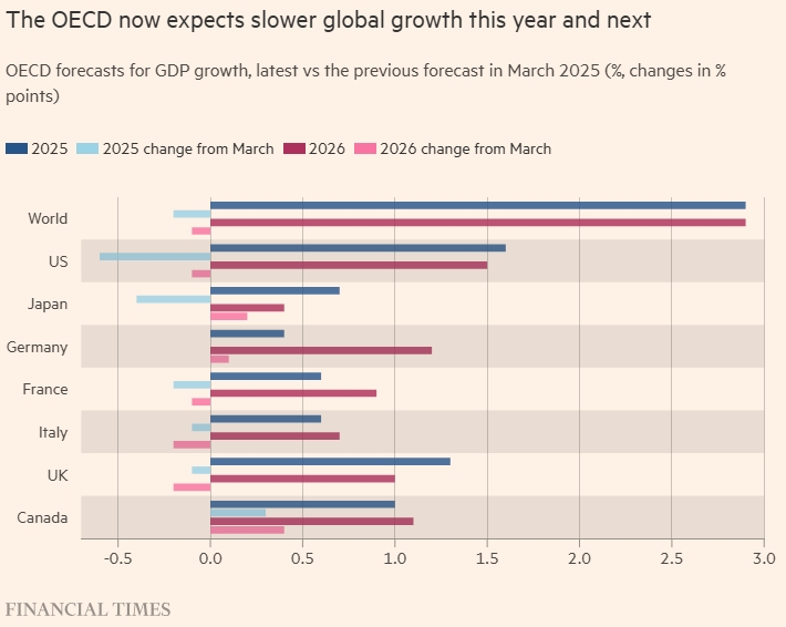ОЭСР ожидает замедления мирового роста в этом и следующем году. Прогнозы ОЭСР по росту ВВП, последний по сравнению с предыдущим прогнозом в марте 2025 г. (%, изменения в %-ных пунктах). FT