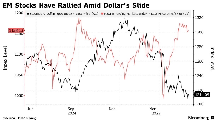 Доллар США торгуется вблизи двухлетних минимумов. Банки Уолл-стрит, включая Morgan Stanley и JPMorgan Chase & Co., прогнозируют дальнейшее ослабление американской валюты из-за возможного снижения процентных ставок, замедления экономического роста и сохраняющейся неопределённости в фискальной и торговой политике. Это может ускорить вывод средств из активов США в развивающиеся страны.