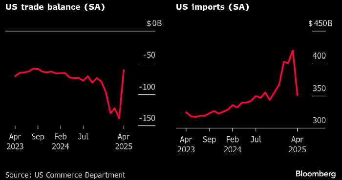 Торговый дефицит США показал в апреле рекордное сокращение благодаря крупнейшему за всю историю падению импорта. Это говорит о резком завершении массового завоза товаров некоторыми компаниями в преддверии повышения тарифов.