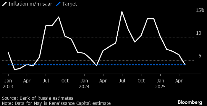 Белым — месячная потребительская инфляция в РФ (в годовом выражении с поправкой на сезонность), голубым — цель по инфляции Банка России. Источник: Bloomberg
