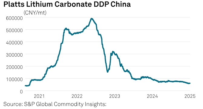Platts, часть S&P Global Commodity Insights, 10 июня оценила карбонат лития для аккумуляторов в 61 000 юаней (8 489 долларов США) за тонну, что на 3 400 юаней за тонну ниже, чем месяц назад.