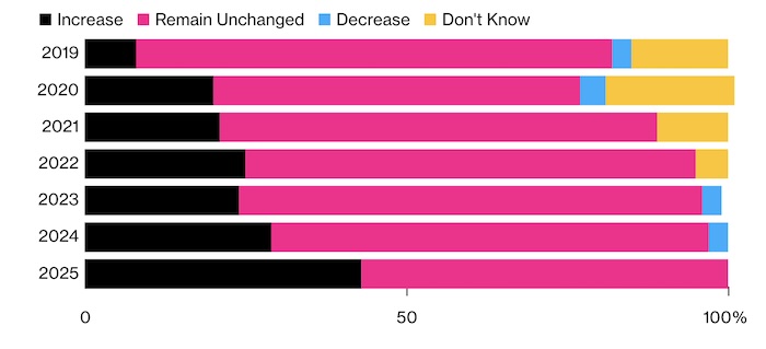 Опрос, проведенный YouGov среди 72 представителей монетарных органов, показал: 43% ожидают увеличения золотых резервов. Это самый высокий показатель за восемь лет ведения статистики Всемирным советом по золоту (ВСЗ) и YouGov. При этом никто не прогнозирует снижения.