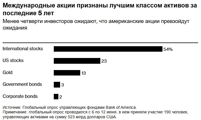 Согласно результатам опроса управляющих фондами Bank of America, в ближайшие пять лет мировые акции будут опережать по доходности американские. Это свидетельствует о том, что инвесторы всё больше сомневаются в дальнейшем доминировании США на рынке.