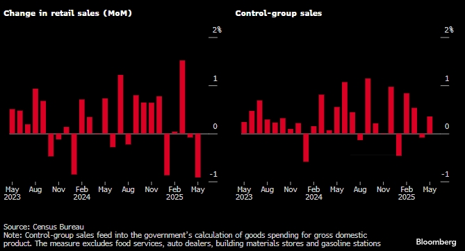 7 из 13 категорий, указанных в отчете, показали снижение, в основном за счет строительных материалов, бензина и автотранспортных средств, так как в мае уже прошел покупательский бум, имевший место в ожидании тарифов, которые были объявлены в апреле. Расходы на рестораны и бары, единственная категория сектора услуг в отчете по розничной торговле, сократилась сильнее всего с начала 2023 года.