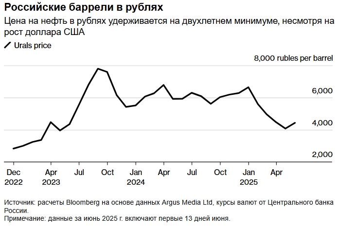 Однако, согласно расчётам Bloomberg, основанным на официальном курсе Центрального банка, в тот день экспортёры России получали всего 4957 рублей за баррель нефти, проданной за рубеж. Это всё ещё на 30% меньше, чем в начале 2025 года.
