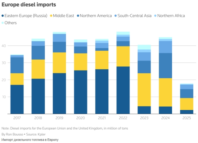 После того как в феврале 2022 года Россия начала СВО на Украине, Европейский союз и Великобритания запретили импорт российской нефти в регион. Это привело к фундаментальным изменениям на европейском рынке дизельного топлива. Доля российского дизельного топлива в импорте региона снизилась с 40% в 2022 году до менее 1% в прошлом году, согласно данным Kpler.