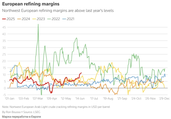 Маржа переработки дизельного топлива в Европе выросла более чем на 30% с начала израильско-иранского конфликта, что является самым высоким показателем за более чем 14 месяцев, согласно данным LSEG. Это примечательно, учитывая одновременный рост цен на нефть, поскольку маржа нефтепереработки обычно движется в противоположном направлении от цен на сырьё. Однако на этот раз европейские нефтеперерабатывающие заводы получают выгоду от того, что рост цен на дизельное топливо опережает рост цен на сырую нефть.