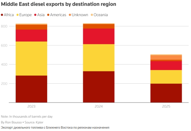 По данным аналитической компании Kpler, Ближний Восток является крупным экспортёром дизельного топлива, отправляя 831 000 баррелей в день в 2024 году, что составляет примерно 17% мирового морского импорта дизельного топлива. Большая часть экспорта приходится на Кувейт, Объединённые Арабские Эмираты и Саудовскую Аравию, которые в последние годы инвестируют в расширение экспортно-ориентированных нефтеперерабатывающих мощностей.