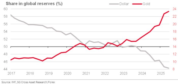 Доля в мировых резервах, в %: доллар США (серым, левая шкала), золото — красным, правая шкала. Источник: Societe Generale