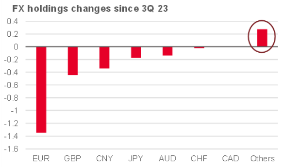 Изменение доли основных валют в мировых резервах с III кв. 2023 г. по настоящее время (в п.п.) Источник: Societe Generale