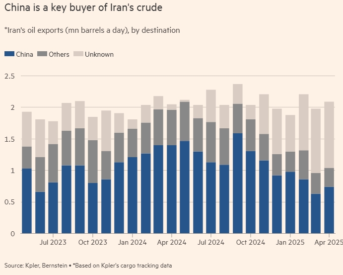 В сентябре 2024 года Иран экспортировал 2,4 млн баррелей нефти в день, из которых 1,6 млн баррелей приходилось на Китай. К апрелю поставки из Ирана сократились до 2,1 млн баррелей в день, из которых 740 000 баррелей приходилось на Китай. Малайзия также является важным экспортёром в Китай, поскольку грузы, отправляемые из Ирана, перемаркировываются или перенаправляются, чтобы избежать санкций, отмечают аналитики.